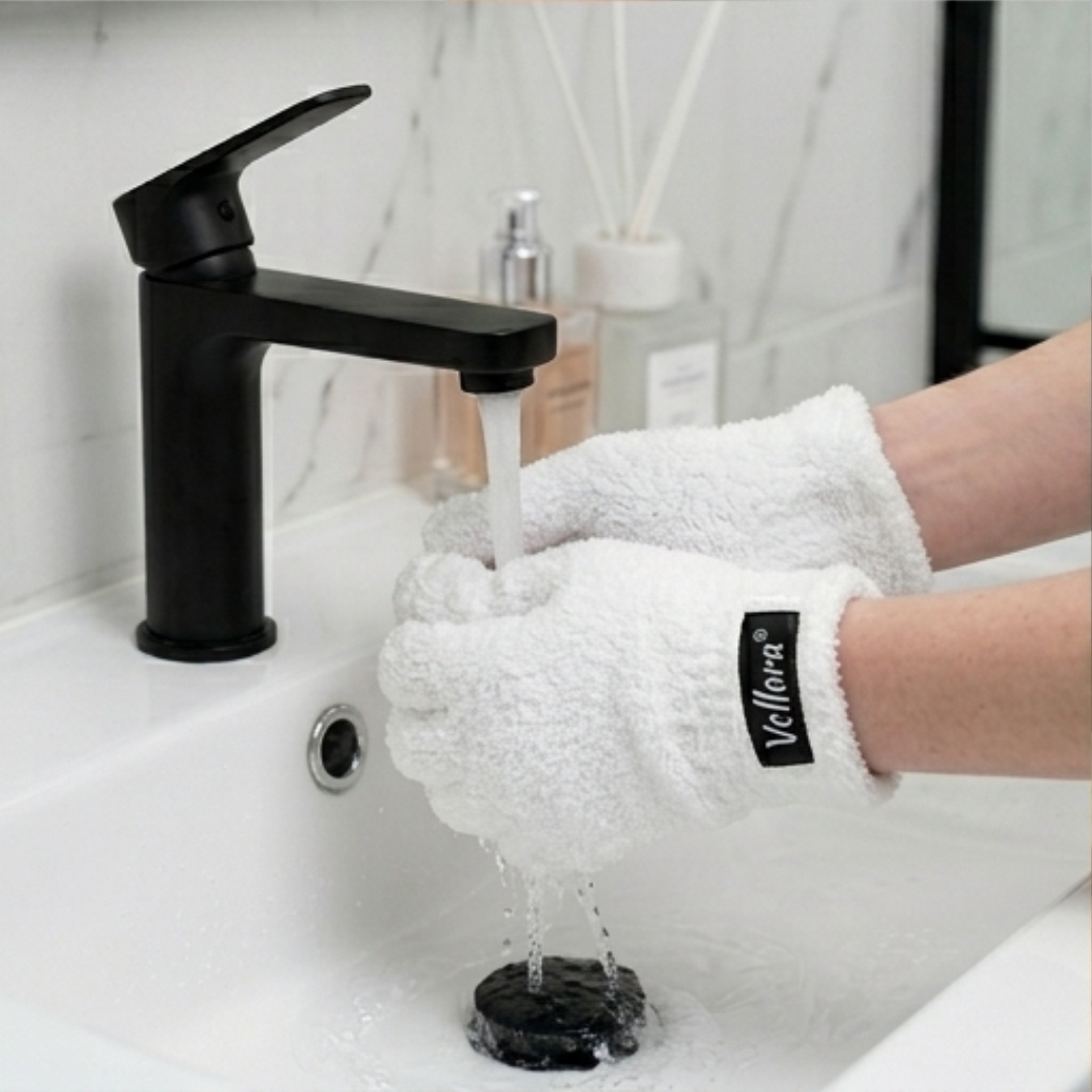 Körkörös, gyengéd mozdulatokkal töröld át az arcod a kesztyűvel, hogy eltávolítsd a sminket. Használat után öblítsd ki folyó víz alatt, finoman nyomkodd át, hogy a maradványok kioldódjanak, majd hagyd megszáradni. Szükség esetén mosógépben is tisztítható.